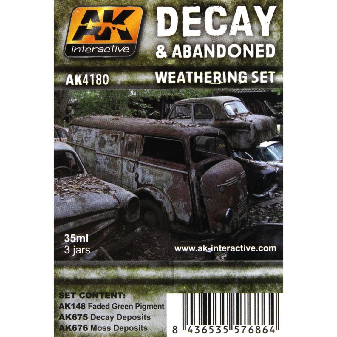Ultra gerçekçi yüzeyler için sürekli yeni ürünler geliştirmeye çalışan AK-Interactive, yeni Çürüme ve Pas Efekti seti ile terk edilmiş, çürüyen araç ve ekipmanlar üzerindeki etkilerini gösteren bir ürün yaptı. Bu set, yosun oluşumu için özel bir sıvı ve emaye bazlı (pas) birikintileri için bir sıvının yanı sıra, gerçekçi efektler için bir pigment içerir. Uygulaması oldukça basittir. Ucu yuvarlak bir fırça yardımıyla modelinize ilk önce çürüme efektini uygulayın. Gerekli yerlerde incelte yaparak kullanabilirsiniz. Daha sonra aynı şekilde yosun efektini dikkatlice uygulayın. En son olaraksa gerçekçiliği arttırman için, yeşil pigmenti uygulayarak işlemlerinize son verin. Yukarıda ki videoda benzer bir çürüme efekti uygulamasını sizlerla paylaştık.