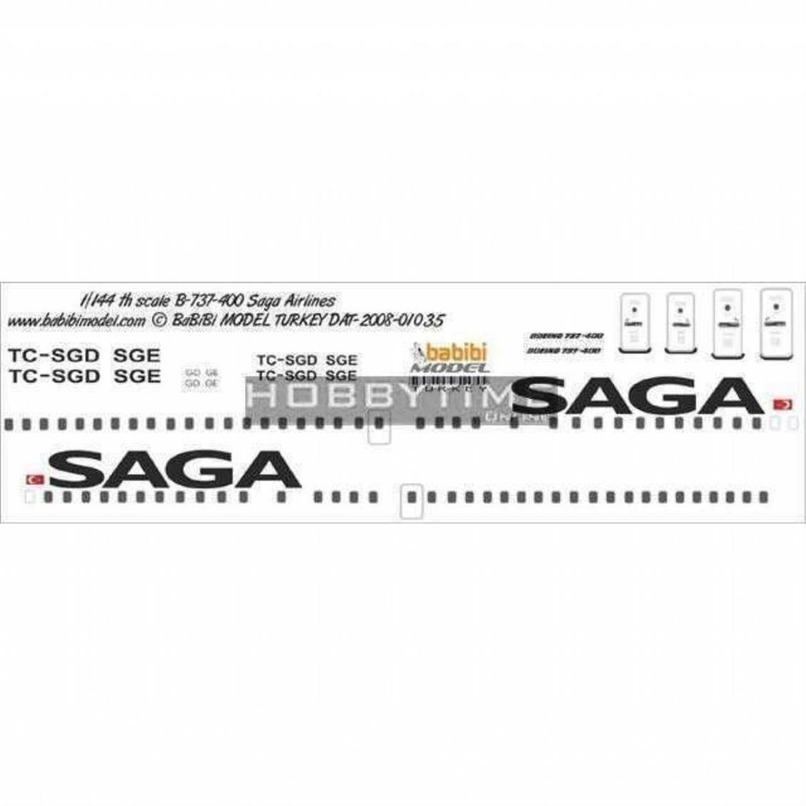 SagaHava Yolları tarafından kullanılan Boeing 737-400 uçağının dekalidir.BabibiFirması birçok hava aracının dekalinin bulunduğu özellikle Türk modelciler tarafından çokça tercih edilen birfirmadır.