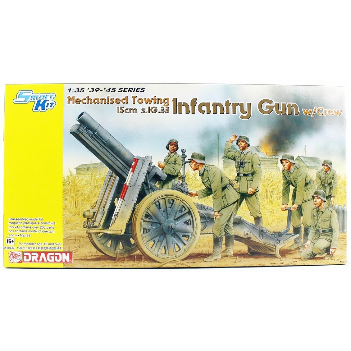 İkinci Dünya Savaşı boyunca Almanya'nın standart ağır piyade silahı Geschu "tz 33 (s.IG.33 ile sözleşmeli), 15 cm kalibreli. Daha büyüktü 7.5cm le.IG.18 piyade silahının karşılığı. 1933'te hizmet için onaylandı, s.IG.33 başlangıçta at çizilecek şekilde tasarlanmıştır. Ancak, sonraki modeller özellikle kamyon veya devre arası gibi araçların arkasında çekme için tasarlanmıştır. Böylece katı kauçuk lastiklerle kaplanmış preslenmiş çelik jantlar vardı, ayrıca hava frenleri.1750kg'da s.IG.33 piyadeler tarafından kullanılmak üzere oldukça ağırdı, ancak HE, duman ve içi boş şarj gibi 15 cm'lik mermiler ateşleyin (tanksavar rolü için) maksimum 4700m aralığına kadar. Belki de en ilginç olanı 90kg Sığınak gibi engelleri yok etmek için tasarlanmış Stielgranate 42 yıkım turu. Dragon, s.IG.33'ün 1/35 ölçekli Akıllı Kitini ve içeriğini geliştirdi kutunun özellikle sonraki piyade silahı modellerinden birini çoğaltması motorlu çekme için mahkum edildi.Kit, gerçekçi bir şekilde işlenmiş tüfeklere sahip bir alüminyum tabanca namlusu içerir. Ayrıntılı hidrolik geri tepme sistemi, tabancanın normal konumda pozlanmasını sağlar veya tam geri tepme sırasında, ayrıca silah namlusu için farklı yükseltiler seçilebilir. Makat, modelleyicinin hangi kısmına bağlı olarak açık veya kapalı olarak da gösterilebilir seçer. Son derece ayrıntılı tabanca kiti bir dizi aksesuarla birlikte gelir. Bunlar arasında silahı ateşlemeye hazır altı kişilik bir silah ekibi var. Bir dizi DS parçası koruyucu cephane hasır kılıfları ve hasır zemin gibi yararlı bileşenlere katkıda bulunur paspaslar. Halihazırda sunulan birkaç 15 cm'lik cephane turuna bonus olarak, kit bile Stielgranate 42 sopa bombası yıkım turuna sahiptir. Bu ustaca önemli bir Alman topçu parçasının kitini üretti ve tüm ekstralarla Ejderha dahil etti,çok arzu edilen bir paketi temsil eder.Tavsiyeler