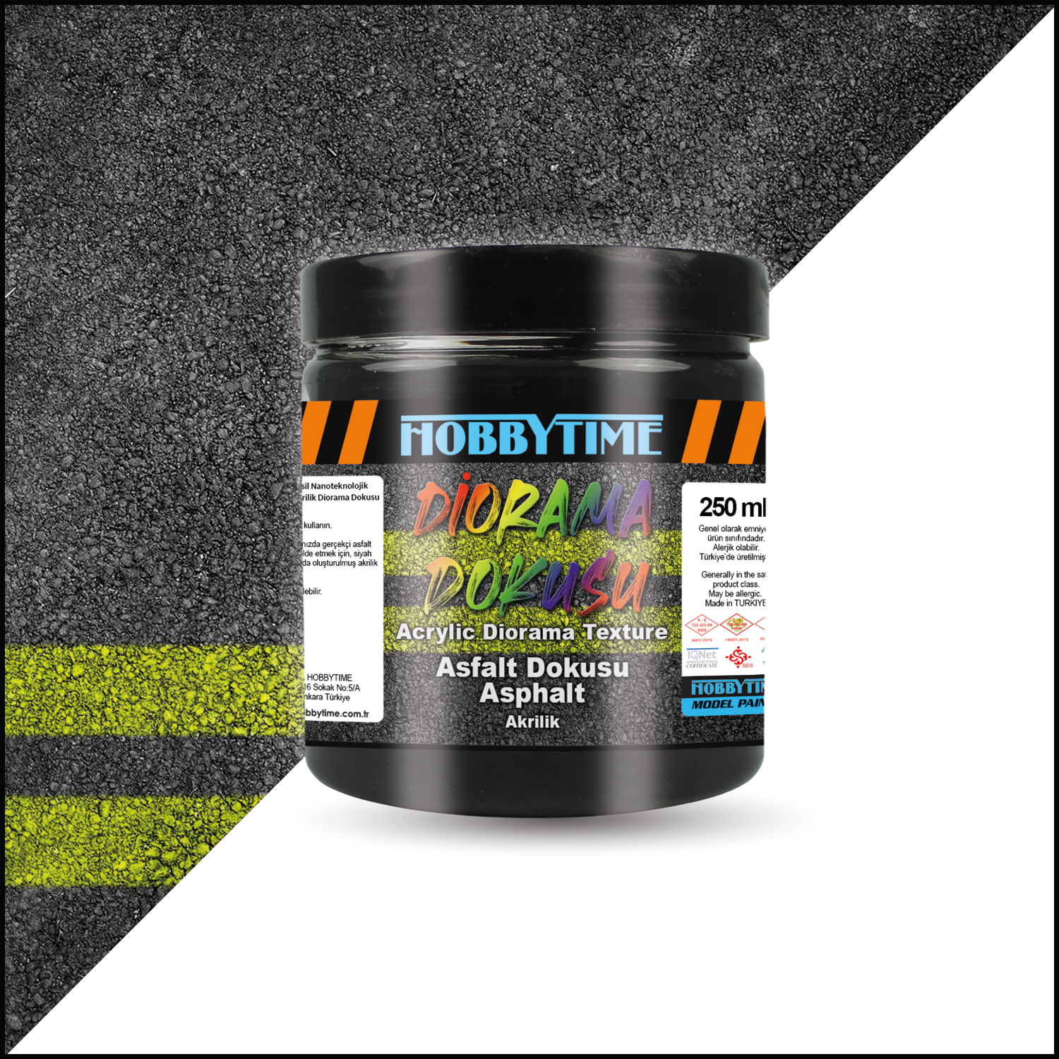 Dioramalarızda gerçekçi asfalt görünümü elde etmek için, siyah ve gri tonlarda oluşturulmuş akrilik doku. Suyla inceltilebilir.